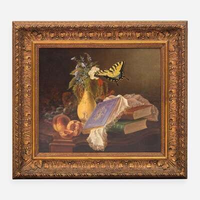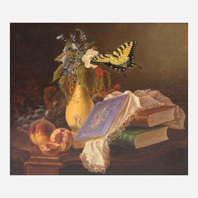 Eliza B. Duffey (American, 1838–1898) - Still Life with Books, Peach and Butterfly