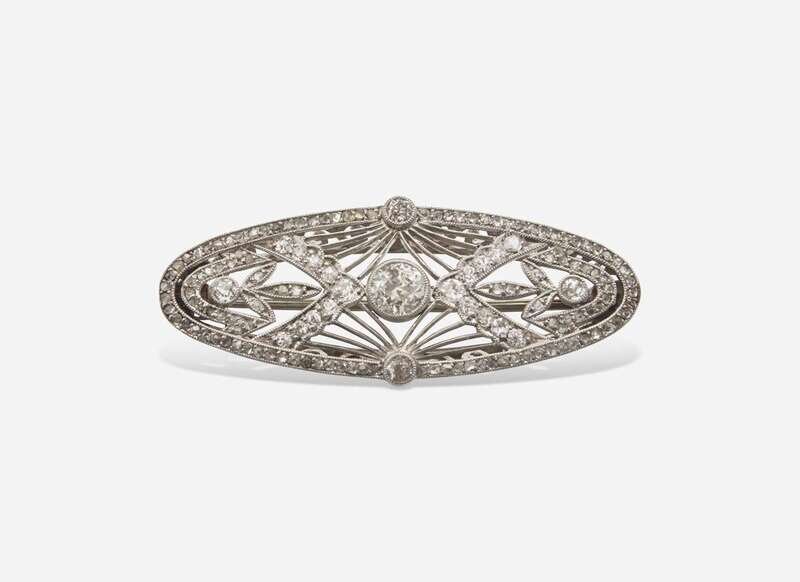 Brooch: Light scratches and wear consistent with age, metal not stamped, testing as 14K white gold, clasp in working order, set with approximately one hundred forty-two single-cut, rose-cut, and old mine-cut diamonds measuring from approximately 0.85mm at the smallest to approximately 4.50mm at the largest, near colorless to faint color (H – L), with SI – I clarity. Total estimated weight of diamonds: 1.00 carat.