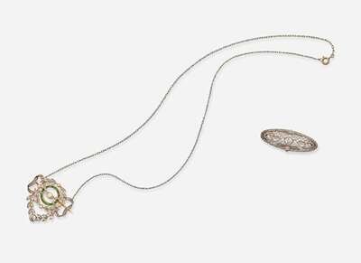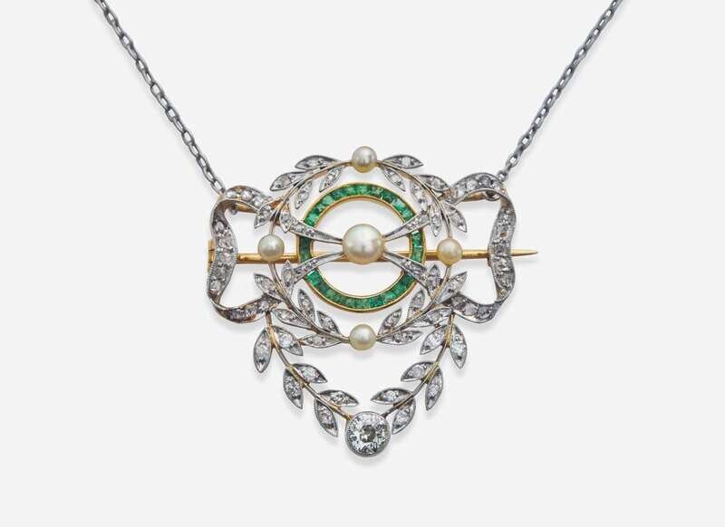 A set of Edwardian jewelry, including a 14K white gold filigree oval brooch set throughout with old mine-cut, single-cut, and rose-cut diamonds, and a platinum and 18K yellow gold brooch, set with creamy near-round pearls, calibre-cut emeralds, and rose-cut, single-cut, and old mine-cut diamonds, also functioning as a pendant on an 18K white gold chain. Diamonds are near colorless to faint color (G – M), with SI – I clarity. Total estimated weight of diamonds: 1.73 carats.