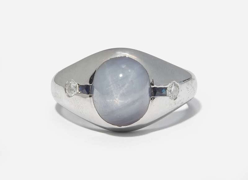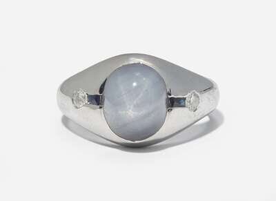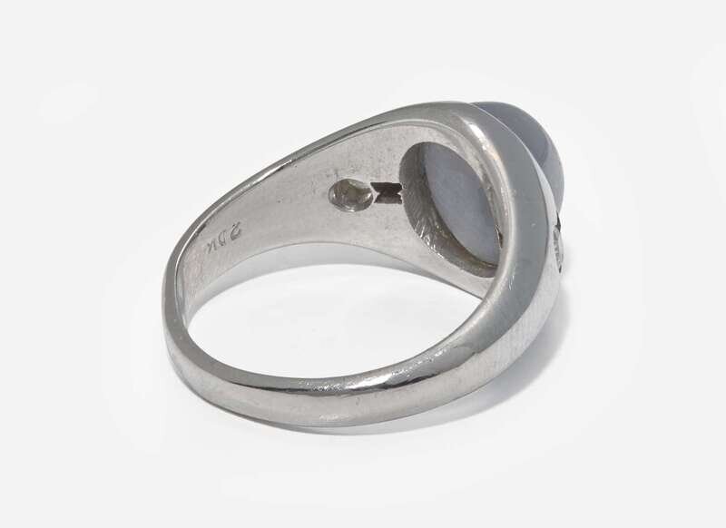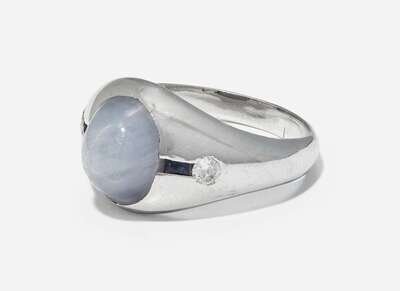 A 20K white gold ring featuring an oval cabochon star sapphire measuring approximately 8.34mm x 10.30mm, flanked by two rectangular-cut sapphires, and two round brilliant-cut diamonds, near colorless (G - J), with VS clarity. Total estimated weight of diamonds: 0.16 carats.