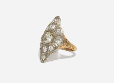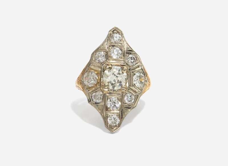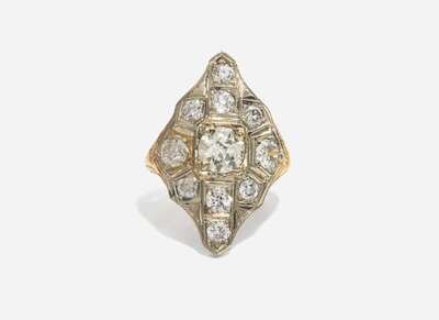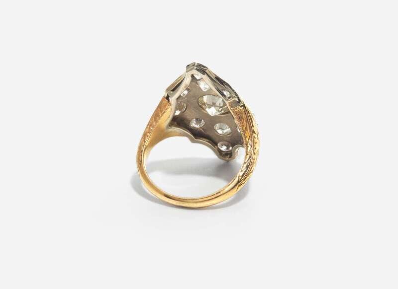 A 14K yellow gold Art Deco ladies ring circa 1920, crafted from textured gold in a geometric design, and set with old European-cut diamonds. Diamonds are near colorless (G – J), with SI – I clarity. Total estimated weight of diamonds: 1.75 carats.