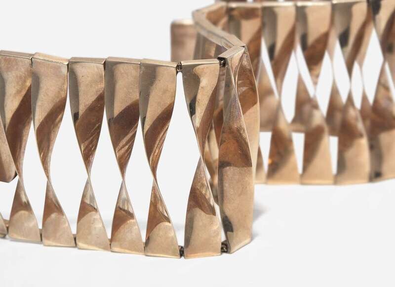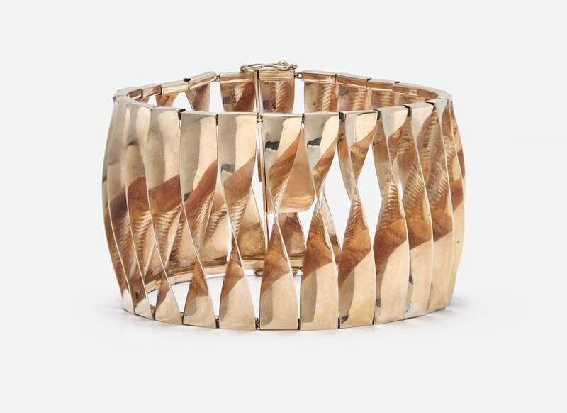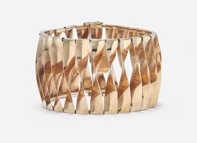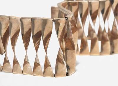 A wide 14K rose gold bracelet, designed as twisting links of rose gold created a wave pattern along the wrist.