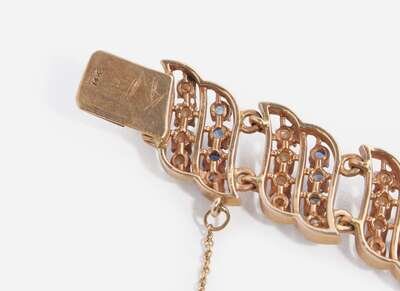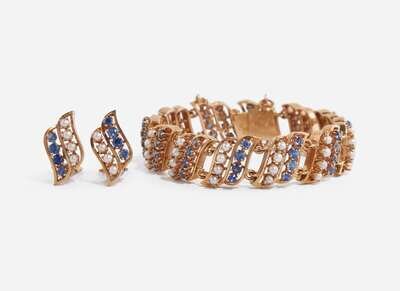 A 14K yellow gold bracelet, designed as swooping links set with round-cut sapphires and round seed pearls, accompanied by a pair of matching earrings, suitable for pierced ears on stud posts with omega clip backs.