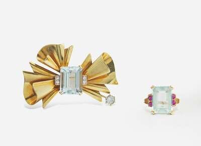 A collection of retro aquamarine jewelry, including a 14K yellow gold brooch designed as a bow featuring an emerald-cut aquamarine with round-cut aquamarine and single-cut diamond accents, and a 14K yellow gold ring featuring an emerald-cut aquamarine flanked by accents of round-cut rubies. Diamonds are near colorless (G – J), with SI – I clarity. Total estimated weight of diamonds: 0.10 carats.