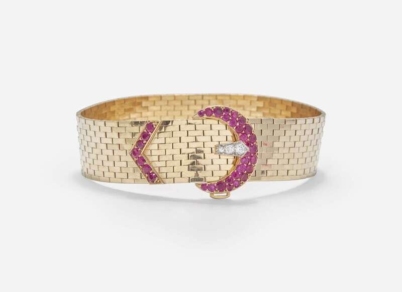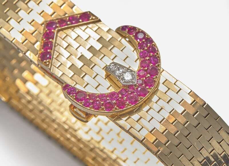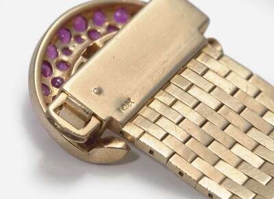 A retro 14K yellow gold bracelet designed as a belt, where the buckle is set with round-cut rubies and round brilliant-cut diamonds, with further round-cut rubies decorating the tip of the belt. Diamonds are near colorless (G - J), with VS clarity. Total estimated weight of diamonds: 0.08 carats.