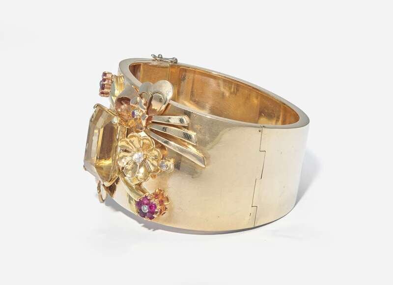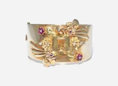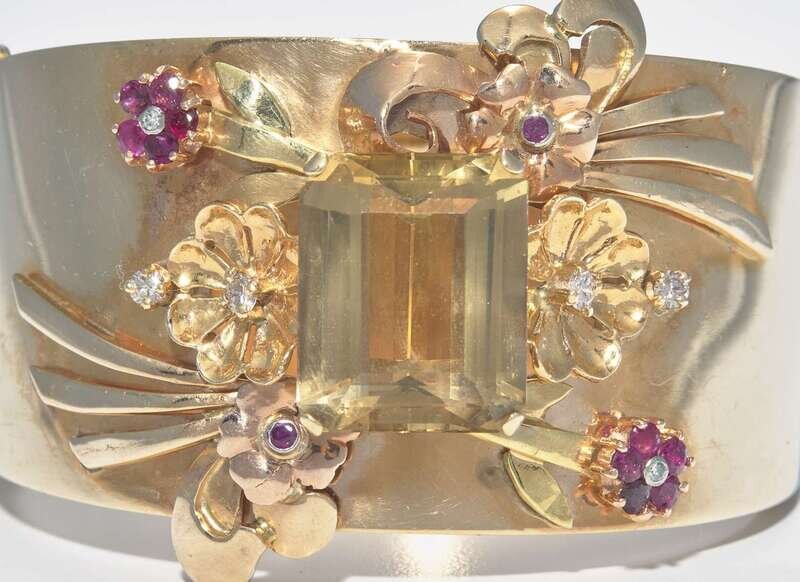 A 14K yellow gold retro bangle bracelet, centering a prominent emerald-cut citrine, within a pattern of protruding flower and bow motifs crafted from yellow gold and accented by round-cut rubies and diamonds. Diamonds are near colorless (G - J), with SI clarity. Total estimated weight of diamonds: 0.40 carats.