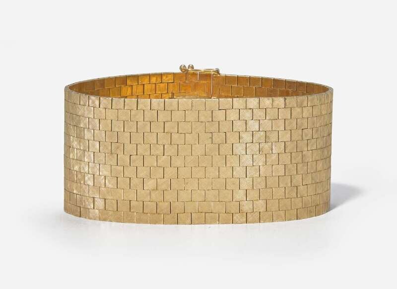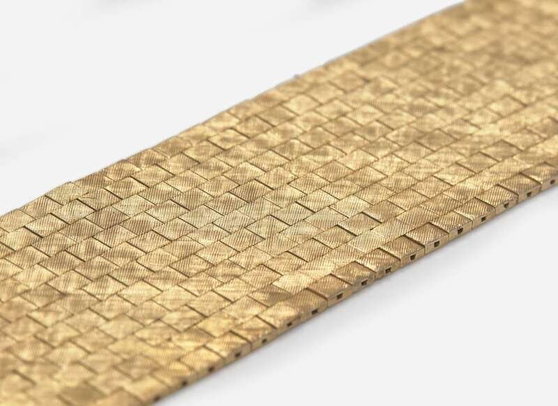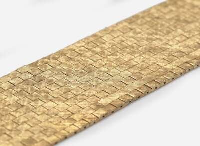 A wide bracelet designed as tightly woven textured links of 14K yellow gold.