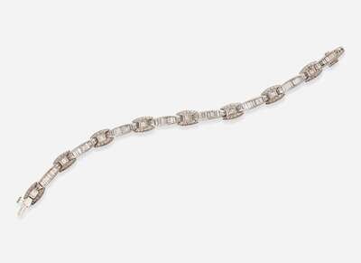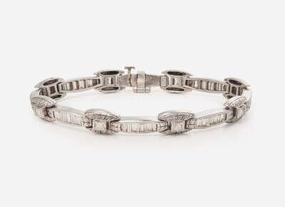 A ladies Art Deco-style bracelet, crafted from platinum in fancy links set throughout with straight baguette-cut and princess-cut diamonds. Diamonds are near colorless (G – J), with VS – SI clarity. Total estimated weight of diamonds: 3.30 carats.