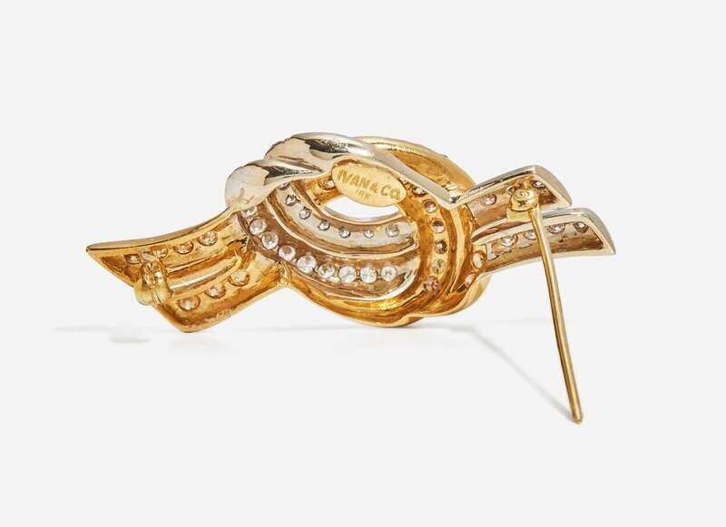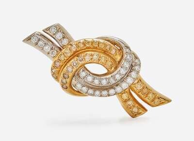 An 18K brooch by Ivan & Company, designed as a two-tone yellow and white gold knot set throughout with yellow and brown diamonds on the yellow gold sections, and near colorless diamonds on the white gold sections. Total estimated weight of diamonds: 1.30 carats.