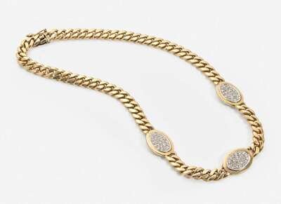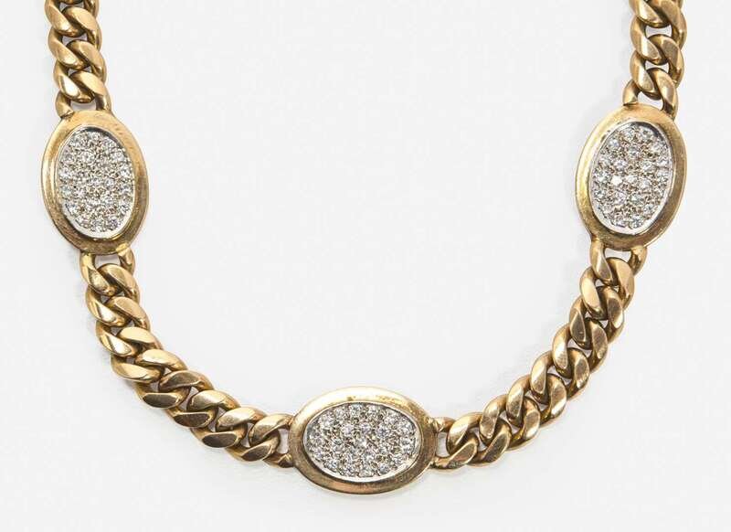 An 18K yellow gold necklace fashioned from Cuban links, with three yellow gold stations each pavé-set with round brilliant-cut and single-cut diamonds, near colorless (G - J), with SI - I clarity. Total estimated weight of diamonds: 1.10 carats.