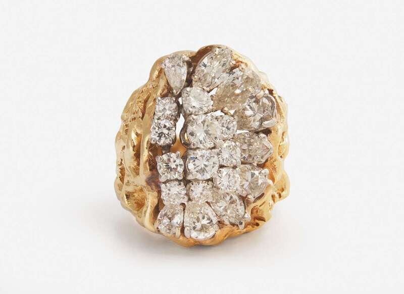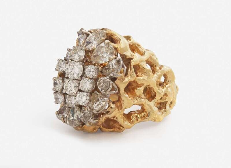 A ladies brutalist 14K yellow gold ring, with an organic openwork shank topped by a cluster of variously-sized pear-shape, marquise-cut, and round brilliant-cut diamonds, near colorless to faint yellow color (G – L), and VS – SI clarity. Total estimated weight of diamonds: 3.75 carats.