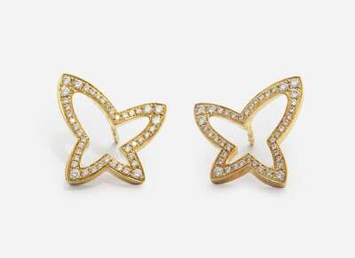 Earrings: Significant scratches and light wear, stamped “750” with Movado hallmark, earring backs likely not original to pair, set with eighty-six round brilliant0cut diamonds measuring from approximately 1.00mm at the smallest to approximately 1.50mm at the largest, near colorless (G – J), with SI – I clarity. Total estimated weight of diamonds: 0.54 carats.