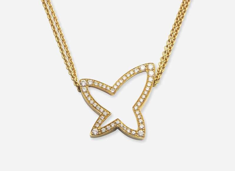 Necklace: Light scratches and wear, stamped “750” with Movado hallmark, clasp in working order, set with fifty round brilliant-cut diamonds measuring from approximately 1.00mm at the smallest to approximately 1.60mm at the largest, near colorless (G – J), with SI – I clarity. Total estimated weight of diamonds: 0.33 carats.