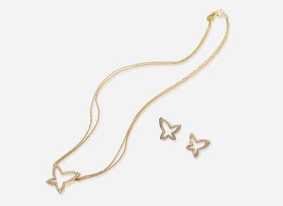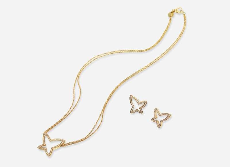 A matching pair of earrings and necklace by Movado, earrings suitable for pierced ears on stud posts, designed as asymmetrical four-pointed stars and set with round brilliant-cut diamonds, and matching pendant on a double strand link chain. Diamonds are near colorless (G – J), with SI – I clarity. Total estimated weight of diamonds: 0.87 carats.