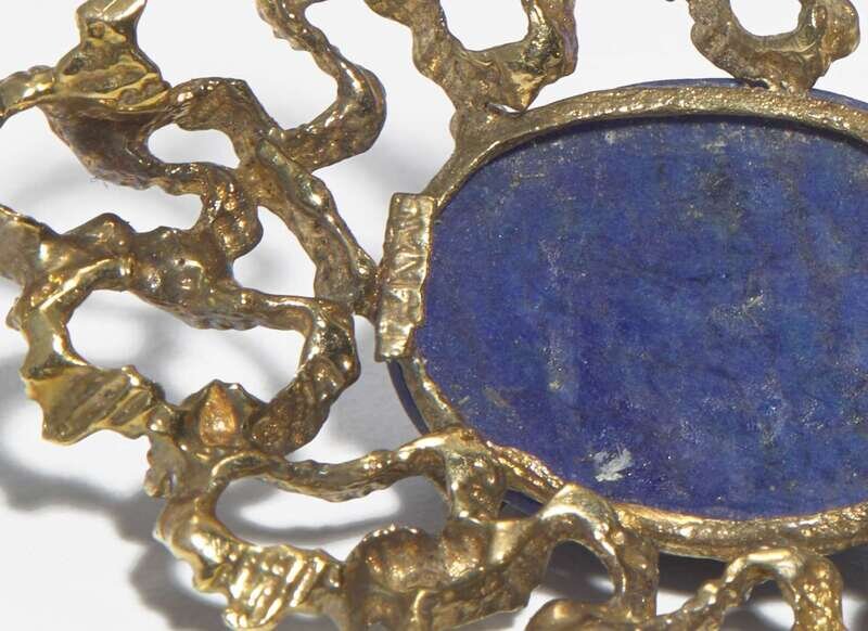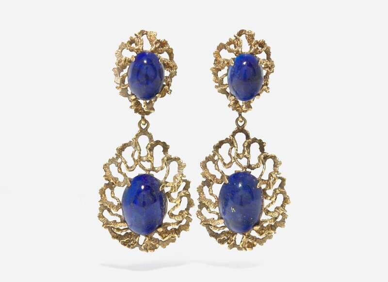 A pair of brutalist style 14K yellow gold earrings, suitable for pierced ears on stud posts, each featuring two oval cabochon lapis in dangling textured yellow gold settings.