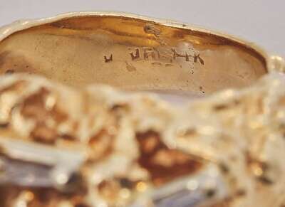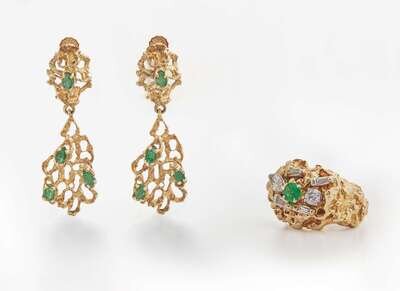 A matching set of Brutalist 14K yellow gold jewelry including a pair of ear clips and a ring, the ear clips suitable for non-pierced ears on screw-down posts with hinge back clips set with pear-shaped emeralds, and a matching nugget ring set with a round-cut emerald and variously-shaped diamonds. Diamonds are near colorless (G – J), with SI – I clarity. Total estimated weight of diamonds: 1.40 carats.