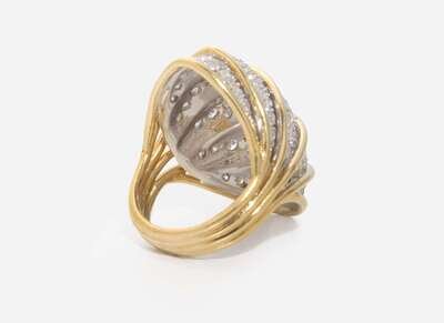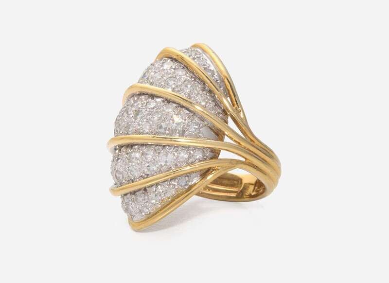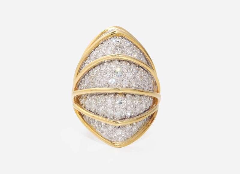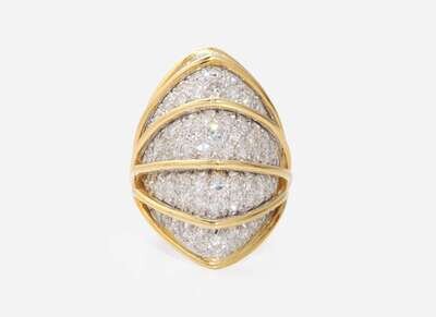 A two-tone ladies 18K yellow and white gold cocktail ring, designed as bands of smooth yellow gold filled with white gold pavé-set with single-cut diamonds. Diamonds are near colorless to faint color (H - L), with SI - I clarity. Total estimated weight of diamonds: 1.71 carats.