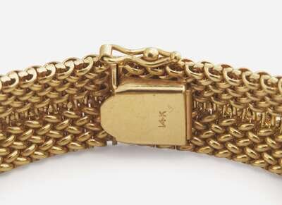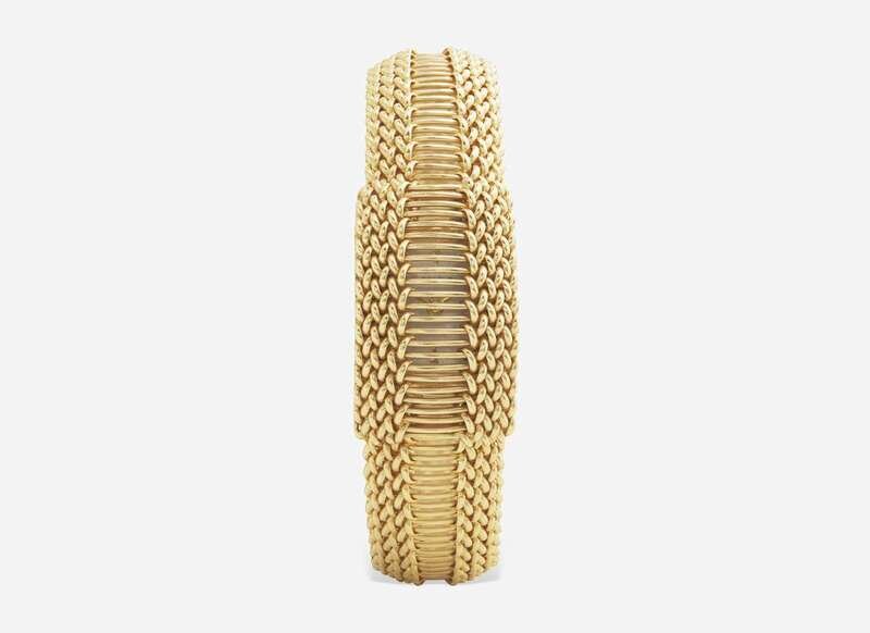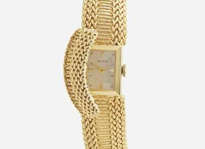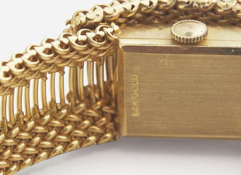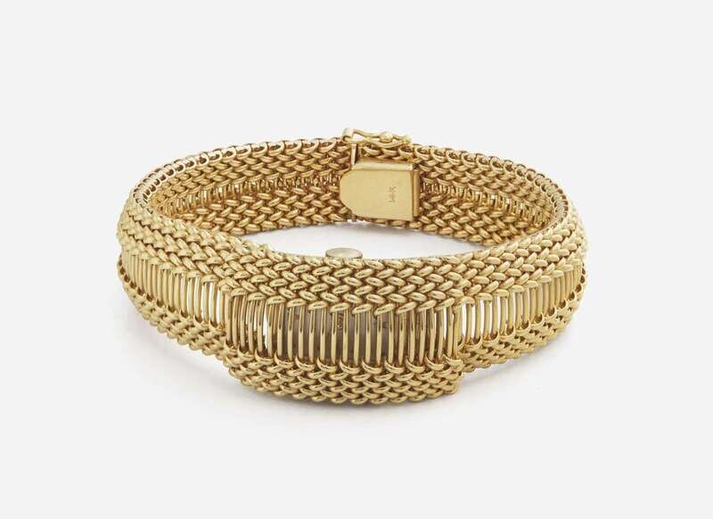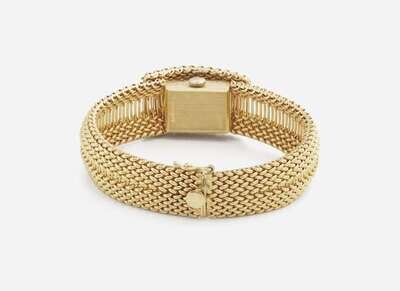 A 14K yellow gold manual wind ladies watch, designed as braided yellow gold with a graduated openwork center ending in a box clasp, with a hidden dial. The rectangular white dial has gold arrow markers at the 12 o’clock, 3 o’clock, 6 o’clock, and 9 o’clock hours, gold circle markers at other hour intervals, and gold stick hands for hours and minutes.
