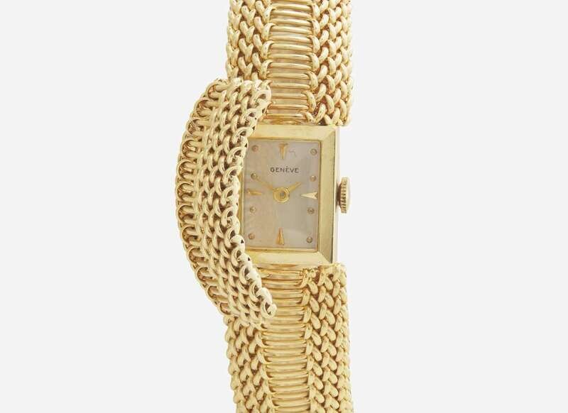 Overall Condition: Light scratches and wear to metal, dial reads “GENVE”, back of case stamped “14K GOLD”, bracelet clasp stamped “14K”, box clasp and figure-eight safety latch in working order, push/pull crown in working order, watch currently runs when wound and appears to be keeping time, minor scratches and wear to crystal, may require additional cleaning.