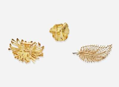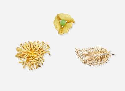 Flower Brooch Width: 1 3/8in; Leaf Brooch Length: 2 3/4in; Leaf Brooch Width: 1 1/4in; Freeform Brooch Length: 2 1/4in; Freeform Brooch Width: 1 3/4in; Weight: 44.5 Gross dwt.