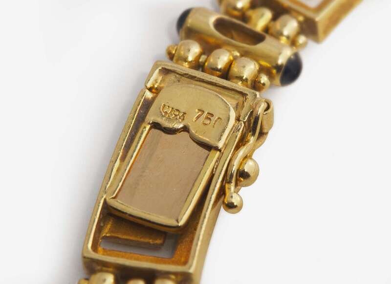 Overall Condition: Some scratches and wear to metal, stamped “750” with maker's mark, box clasp and figure-eight safety latch in working order.