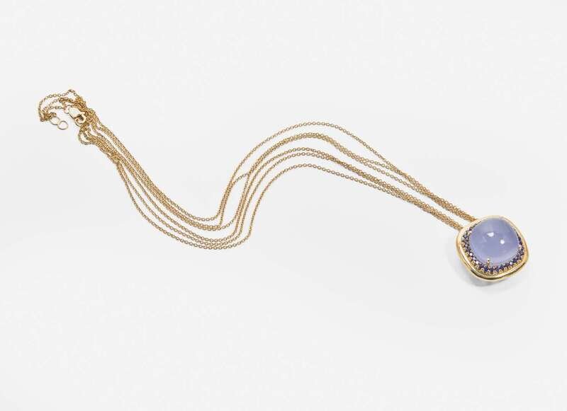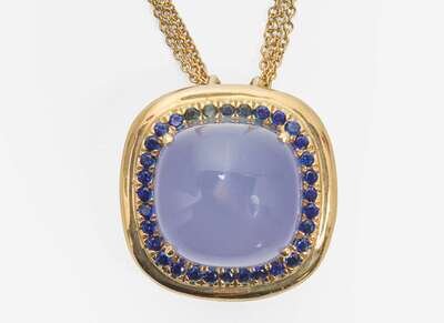 An 18K yellow gold pendant featuring a prominent cabochon blue chalcedony surrounded by a halo of round-cut sapphires, suspended from a delicate three-strand 18K yellow gold chain. The chain has two jump rings to secure the necklace at alternate lengths.