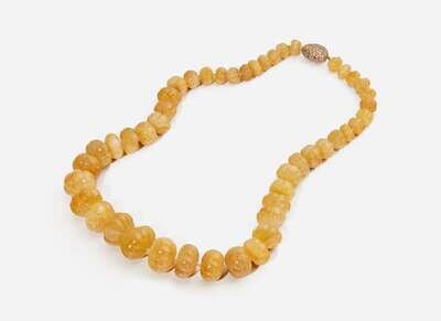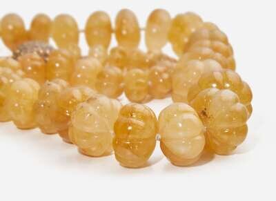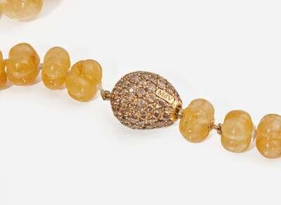 A necklace by designer Michele della Valle, crafted from forty-seven carved yellow sapphire beads, finished by a yellow gold clasp set with brownish round brilliant-cut diamonds. Total estimated weight of diamonds: 4.50 carats.