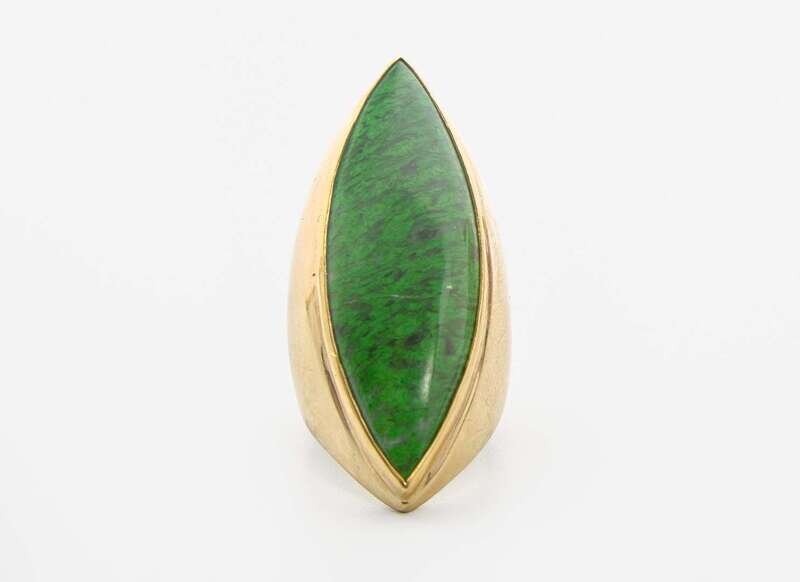 Ring: Some scratches and wear to metal, metal not stamped, testing as 18K, set with a smooth Maw-Sit-Sit stone measuring approximately 15.20mm x 47.30mm.