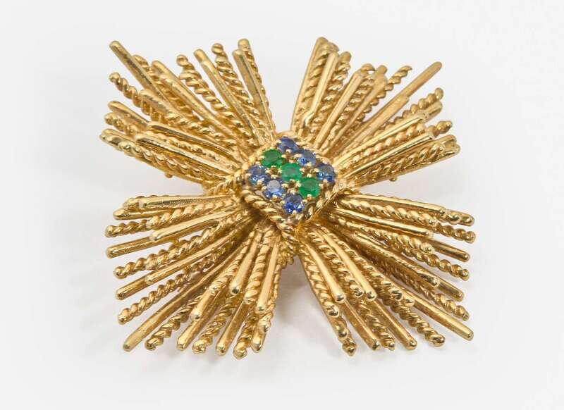 An 18K Yellow Gold, Sapphire, and Emerald Brooch