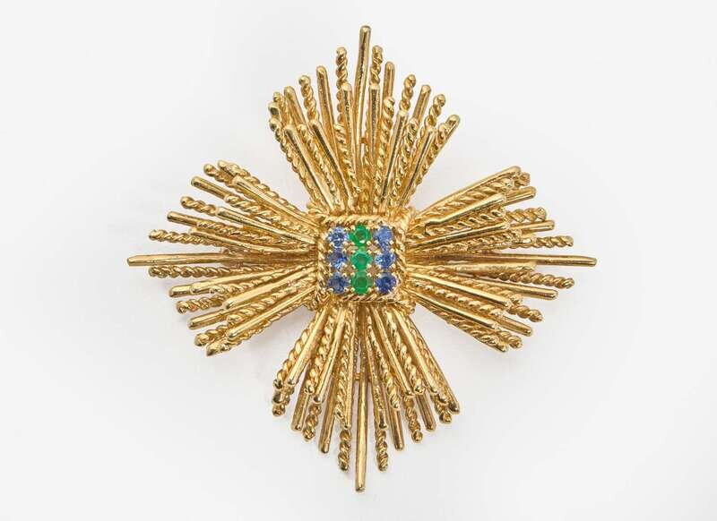 An 18K yellow gold brooch also functioning as a pendant, designed in the shape of a Maltese cross, with round-cut emeralds and sapphires in the center, surrounded by radiating polished and twisted gold rods.