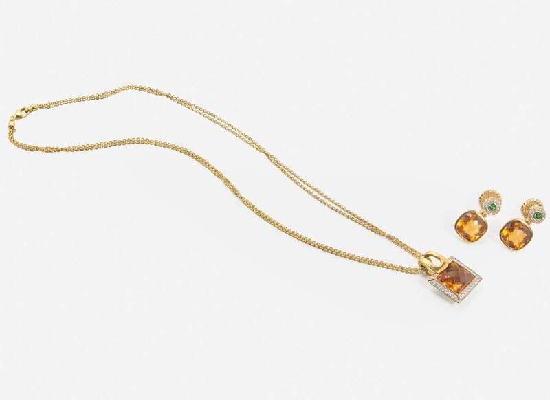 A pair of 18K yellow gold earrings by Cordova, suitable for pierced ears on stud posts with 14K yellow gold butterfly earring backs, designed as bezel-set rounded square faceted-cut topaz hanging from a drop that features a round-cut emerald surrounded by a halo of round brilliant-cut diamonds, and an 18K yellow gold necklace with a double chain, featuring a removable pendant set with a square faceted-cut citrine surrounded by round brilliant-cut diamonds. Diamonds are near colorless (G – J), with SI clarity. Total estimated weight of diamonds: 0.13 carats.