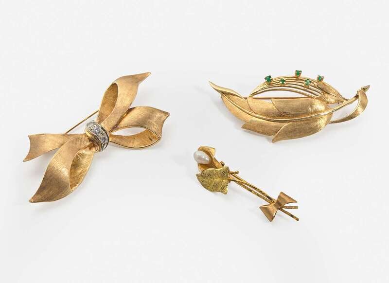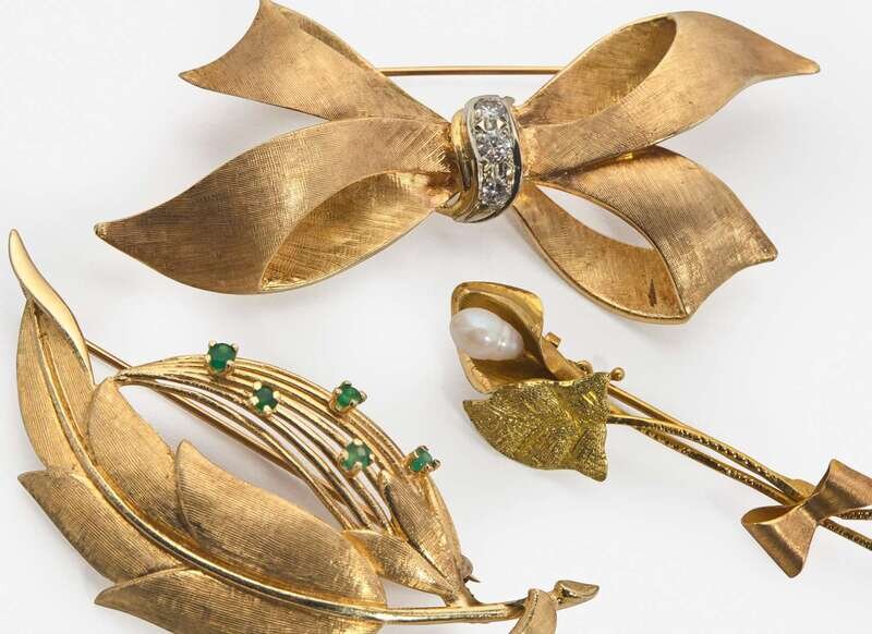 A collection of three 14K yellow gold brooches, including a bow brooch with diamond accents, a leaf brooch set with round-cut emerald accents, and a flower brooch set with a single baroque pearl.