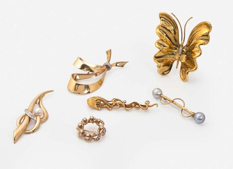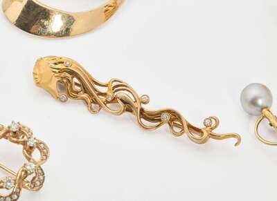 A miscellaneous collection of yellow gold brooches and pins, including an 18K yellow gold butterfly brooch set with round brilliant-cut diamonds, an 18K yellow gold pin designed as a woman in profile with her hair trailing behind her accented by round brilliant-cut diamonds, an 18K yellow gold brooch set with two silvery pearls, a 14K yellow gold brooch designed as a wreath set with round brilliant-cut diamonds and seed pearls, a 14K yellow gold brooch designed in a ribbon shape with round brilliant-cut diamond accents, and an organically shaped 14K yellow gold brooch set with a round white pearl with pinkish overtone and round brilliant-cut diamonds.