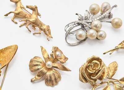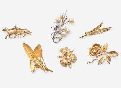 A miscellaneous collection of brooches, including a 14K yellow gold brooch designed as a rose, an 18K yellow gold brooch designed as swooping textured geometric forms, a 14K yellow gold brooch designed as two horses running, a 14K yellow gold brooch designed as two slender leaves, a 14K yellow gold brooch designed as a flower set with two round white cultured pearls, and a 14K white gold brooch set with seven semi-baroque and near-round pearls.