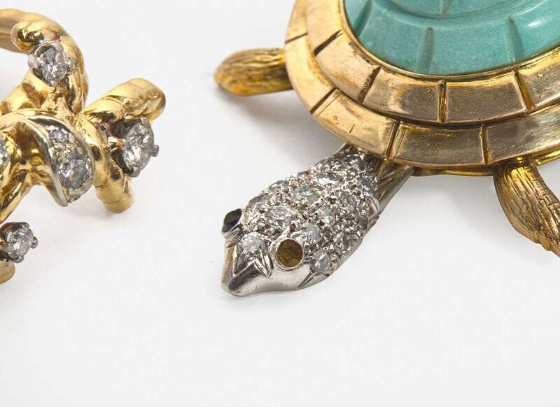 Turtle Pin: Significant scratches and wear, stamped “18K”, set with a carved turquoise measuring approximately 18.86mm x 25.02mm, one blue topaz measuring approximately 1.55mm, one blue topaz is missing, and nineteen single-cut and round brilliant-cut diamonds measuring from approximately 1.40mm at the smallest to approximately 1.70mm at the largest, near colorless (G – J), with SI – I clarity. Total estimated weight of diamonds: 0.25 carats.