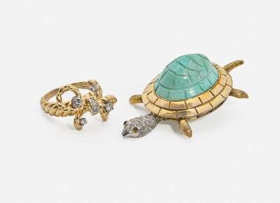 A figural turtle pin crafted from 18K yellow gold, with a carved turquoise shell, and a white gold articulated head pavé-set with round brilliant-cut diamonds, and a round-cut blue topaz eye, together with an 18K yellow gold “Remember Me” knot ring, with round brilliant-cut diamond accents. Diamonds are near colorless (G - J), with SI - I clarity. Total estimated weight of diamonds: 0.69 carats.