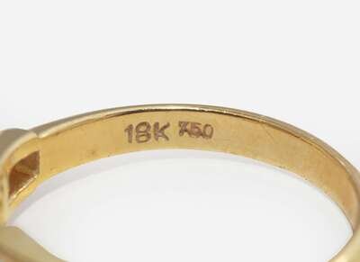 Ring: Minor scratches and wear, stamped “18K 750”, set with one emerald-cut diamond measuring approximately 5.25mm x 6.35mm, and ten tapered baguette-cut diamonds measuring from approximately 1.60mm x 3.18mm at the smallest to approximately 1.34mm x 3.58mm at the largest, near colorless (G – J), with VS – SI clarity. Total estimated weight of diamonds: 1.20 carats.