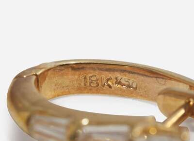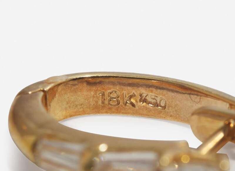Earrings: Minor scratches and wear to metal, stamped “18K 750”, set with two emerald-cut diamonds each measuring approximately 3.55mm x 4.40mm, and ten tapered baguette-cut diamonds measuring from approximately 1.39mm x 3.85mm at the smallest to approximately 1.45mm x 4.45mm at the largest, near colorless (G – J), with VS – SI clarity. Total estimated weight of diamonds: 1.10 carats.