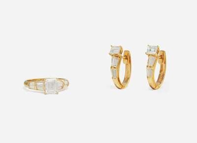 A set of 18K yellow gold jewelry, including a ring featuring an emerald-cut diamond with further tapered baguette-cut diamond accents leading down the shank, and a pair of matching earrings. Diamonds are near colorless (G – J), with VS – SI clarity. Total estimated weight of diamonds: 2.30 carats.