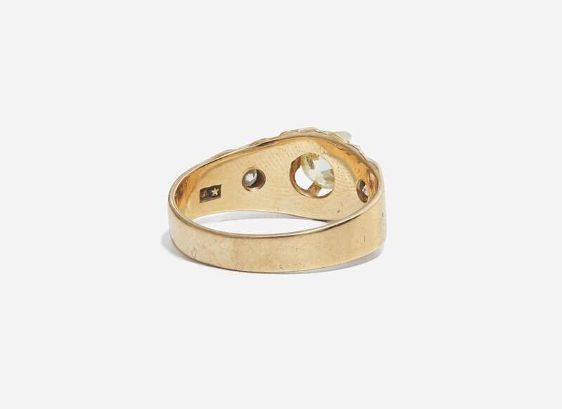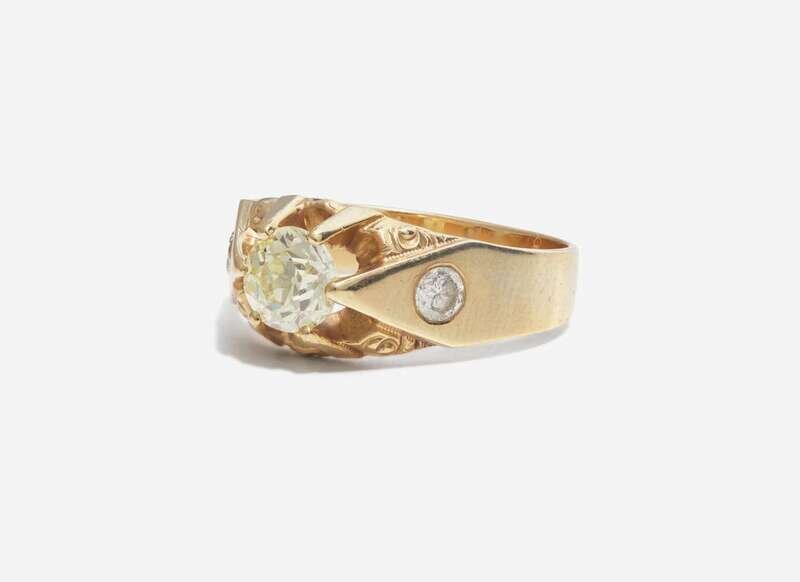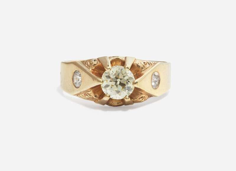 A ladies 14K yellow gold ring centering an antique old European-cut diamond with (N – R) color in a prong-setting, with a wide shank accented by two bezel-set round brilliant-cut near colorless (G – J) diamonds. Diamonds have SI – I clarity. Total estimated weight of diamonds: 1.00 carat.