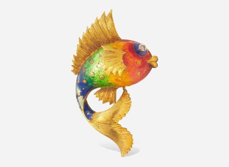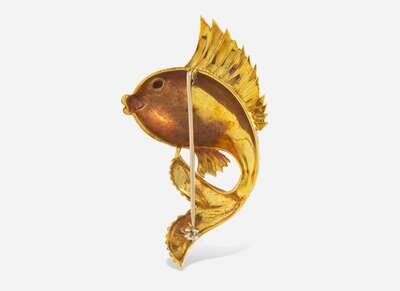 An 18K yellow gold brooch, designed as a colorful fish, crafted from highly textured yellow gold and set with delicate enamel in shades of blue, green, yellow, and orange, with a bezel-set single-cut diamond as its eye. Diamond is near colorless (G – J), with VS – SI clarity.