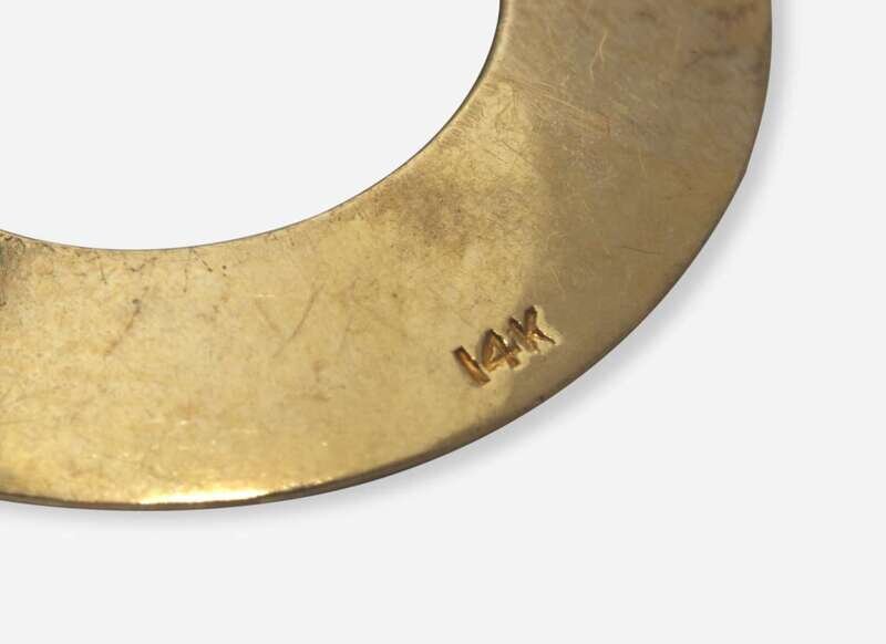 Circle Brooch: Measures approximately 1in wide, scratches and wear to metal, stamped “14K”, clasp in working order.