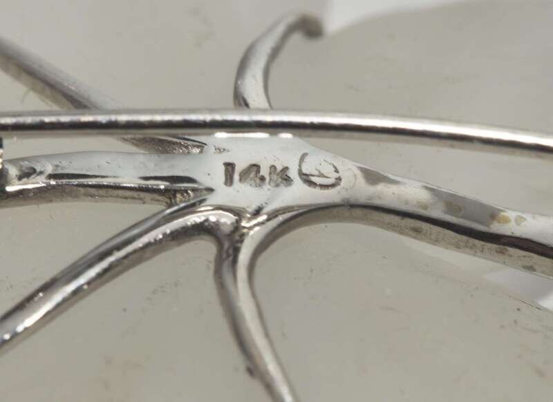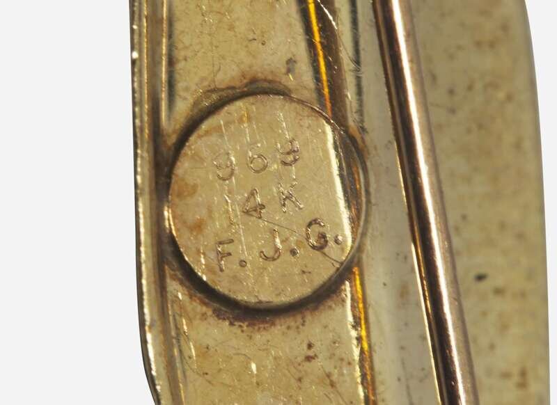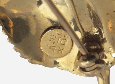 Thin Leaf Brooch: Measures approximately 1.2in x 2in, significant scratches and wear particularly to back of brooch, stamped “969 14K F.J.G.”, clasp in working order.