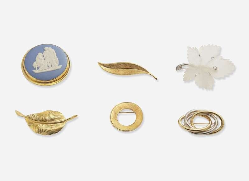 A miscellaneous collection of brooches, including a textured 14K yellow gold circle brooch, a 14K yellow gold and Wedgwood cameo brooch also functioning as a pendant, two 14K yellow gold leaf brooches, a two-tone 14K yellow and white gold intertwined oval brooch, and a 14K white gold brooch set with a carved rock crystal quartz designed as a leaf and a round brilliant-cut accent diamond, near colorless (G – J), with VS – SI clarity.
