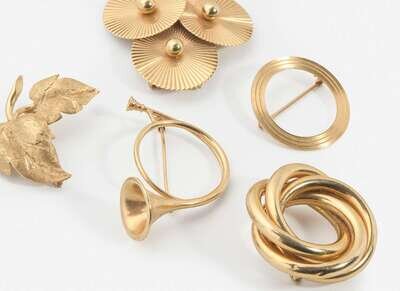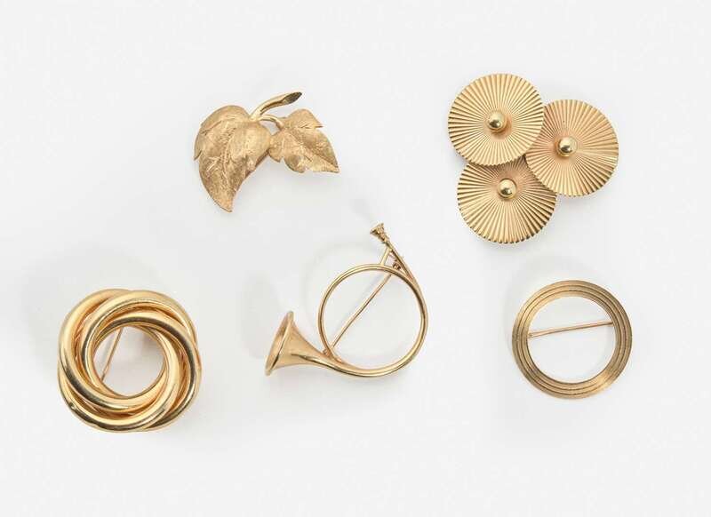 A collection of yellow gold brooches, including a 14K gold brooch by Tiffany & Company in the shape of a horn, a 14K yellow gold pin designed as three ridged circles centering yellow gold baubles, a 14K gold wreath pin fashioned from three intertwining hollow rings, a 14K gold circle pin, and a 14K yellow gold brooch designed as textured gold leaves.