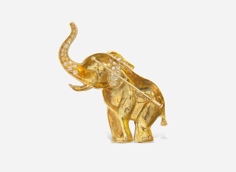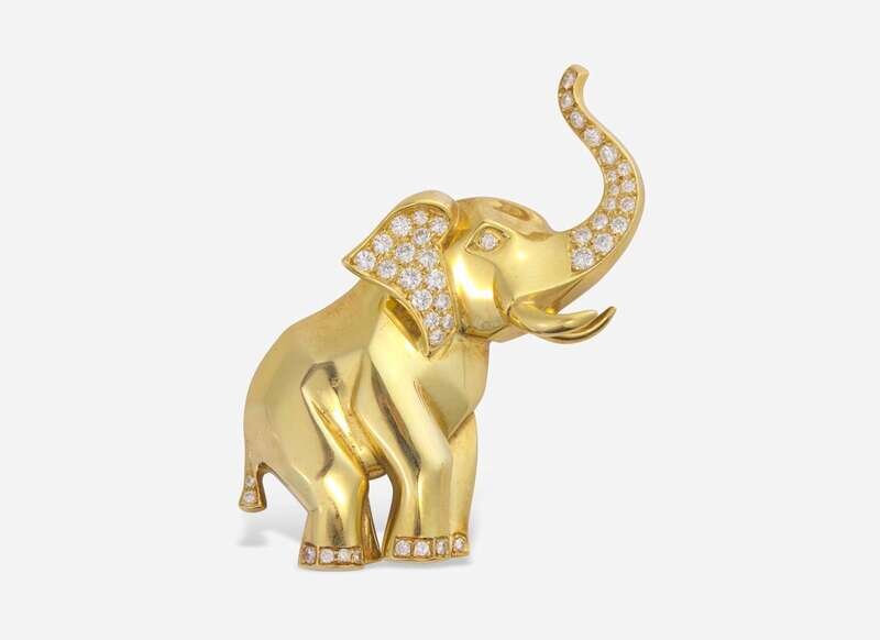 An 18K yellow gold brooch designed as an elephant, and set with round brilliant-cut diamond accents. Diamonds are near colorless (G – J), with VS – SI clarity. Total estimated weight of diamonds: 1.10 carats.