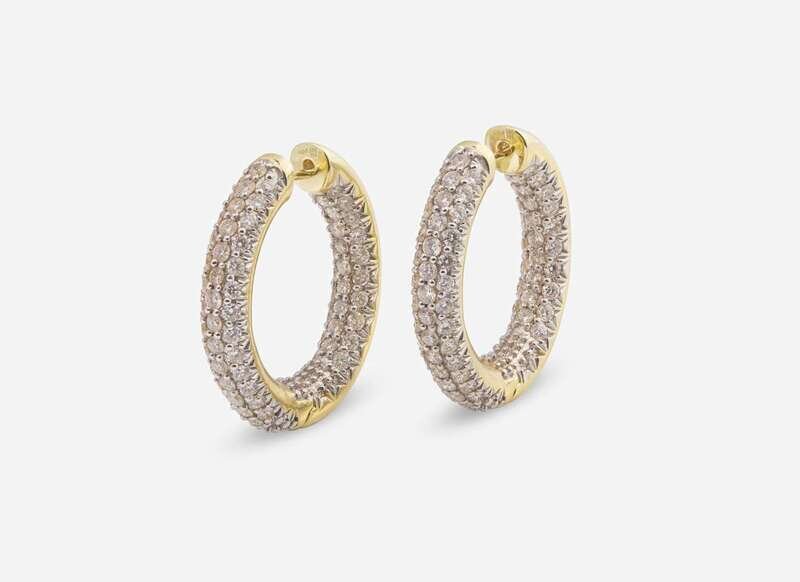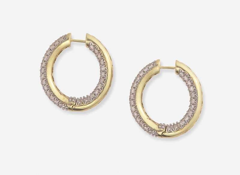 A pair of 14K yellow gold inside-out hoops pave-set with round brilliant-cut diamonds. Diamonds are near colorless (G – J), with SI – I clarity. Total estimated weight of diamonds: 2.20 carats.