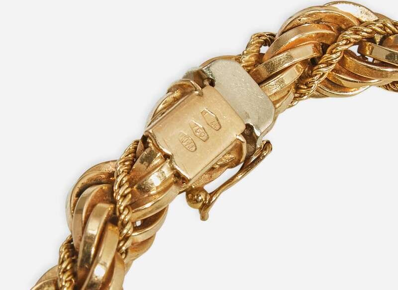 Rope Bracelet: Measures approximately 7 1/2in, stamped “1 AR 750 UNOAR”, box clasp closes but does not stay shut, figure-eight safety latch in working order.