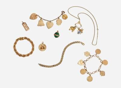 A miscellaneous collection of yellow gold jewelry, including a 14K yellow gold children’s charm bracelet with variously-shaped engraved gold charms, an oval link charm bracelet with variously-shaped engraved gold charms, a 14K yellow gold fancy link bracelet, an 18K yellow gold wide twisted rope chain bracelet, an 18K yellow gold and green stone charm, a 14K yellow gold ‘B’ charm, a 14K yellow gold necklace with four charms variously set with gemstones, and a circular 14K yellow gold ‘Happy Anniversary’ charm.