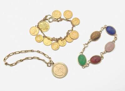 A collection of three 14K yellow gold bracelets, including a scarab bracelet with bezel-set oval-cut gemstones in a variety of colors, an oval-link bracelet with an engraved circular charm depicting a lady, and a bracelet with various gold coins including ten United States Liberty Dollar coins and an 18K commemorative coin.